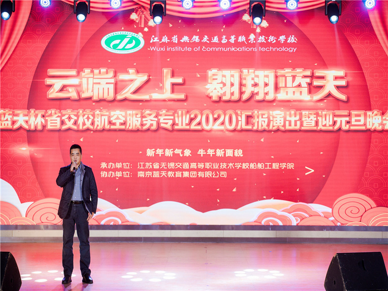 为展示学校航空服务专业学生良好的专业素养和精神风貌,12月9日,学校在大礼堂举办了“蓝天杯”航空服务专业2020汇报演出暨迎元旦晚会。学校党委书记、校长李虎,泰州职业技术学院党委副书记钟文乐,南京蓝天教育集团董事长朱正华出席活动。本次汇报演出由开云·官方端网页版登录入口船舶工程学院承办,南京蓝天教育集团有限公司协办。学校各处室、院部的领导,教师代表、学生代表以及航空服务专业的家长代表700余人参加了本次活动。活动还特别邀请了泰州职业技术学院以及南京蓝天教育集团的领导和嘉宾。