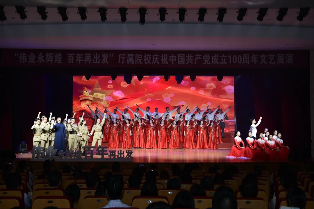 本次文艺展演,表演节目全部由厅属院校自创自编自演而成,以歌曲、朗诵、舞蹈、情景剧、独唱、合唱等艺术形式,体现了厅属院校师生的风采,歌颂了中国共产党百年历程中所取得的伟业,展现了交通人爱党爱国的坚定信念和行动自觉。整场演出在舞蹈《红旗颂》中开幕,在情景朗诵《红船,从南湖起航》中,沿着红船的航线,重温了中国共产党的光辉历程;一曲悲怆的《长城谣》,唱出背井离乡人们的心声,激起人们前仆后继抗日救亡的豪情;武术《少年中国说》,表达了交通青年对祖国的拳拳热爱;歌曲《再一次出发》用一首歌的时间,唱出了心中所有对祖国的崇敬与爱恋;大合唱《向往》表达了交通人永远跟党走,奋进新时代的爱国情怀……最后演出在声情并茂的散文诗《歌唱!祖国》中结束。整场文艺展演内容丰富、形式多样,精彩的演出深深吸引和打动了现场观众,赢得了热烈而持久的掌声。截止演出活动结束,线上直播平台共收获10.5万人次的点击量。