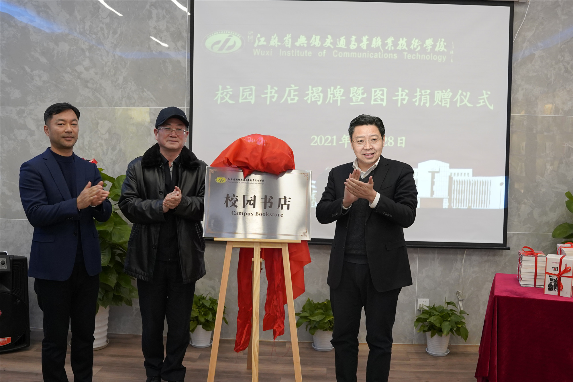 12月28日,学校校园书店揭牌暨图书捐赠仪式在校园书店二楼隆重举行。江苏联合职业技术学院党委书记夏成满,江苏联合职业技术学院教学管理处处长徐伟,学校党委书记、校长李虎,学校党委委员、副校长倪依纯,校园书店建设单位江苏圣晔企业管理咨询有限公司总经理芮郡,参加联合学院无锡地区办学单位党建工作研讨交流会参会领导及嘉宾、学校师生代表近50余人参加会议。会议由学校党委副书记、五级职员朱雨兰主持。