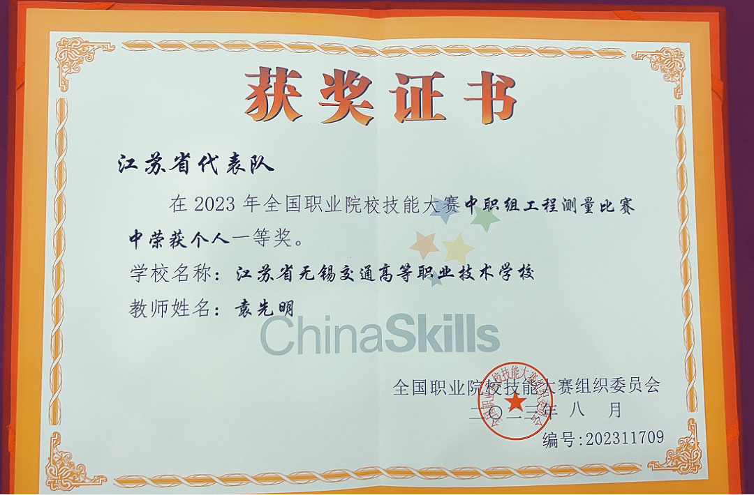 8月20-24日,2023年全国职业院校技能大赛工程测量赛项在浙江绍兴市中等专业学校举行,来自全国各省市54支教师参赛队,69支学生组参赛队同台切磋技艺。经过激烈的比拼,学校交通工程学院袁先明老师以超强的实力和扎实的专业功底,获教师组一等奖。