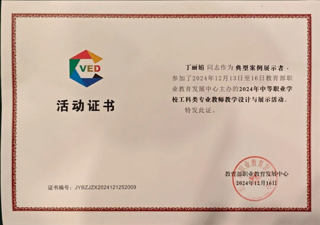 12月13-16日,由教育部职业教育发展中心主办,高等教育出版社承办,2024年中等职业学校工科类教师教学设计与展示活动在南宁圆满落幕。本次活动以“提升教师教学能力,促进教师专业发展”为核心主题,为全国中等职业教育的教师们呈现了一场精彩纷呈的教学盛宴。来自全国的参赛教师们从教材内容解读、教学策略运用、教学过程设计、教学反思提升等多个维度开展说课展示,并现场呈现教学设计方案、教学课件及微课视频等教学作品。 学校丁丽娟老师凭借出色的教学设计《驱动电机性能检测》,经过专家评审、现场说课、微课视频展示与现场答辩等多轮环节评选,在汽车类专业选手中脱颖而出,被评为“典型案例展示者”,其参赛作品将被收录入全国中等职校工科类教师教学设计典型示范性案例集,由高等教育出版社出版并向全国推广。