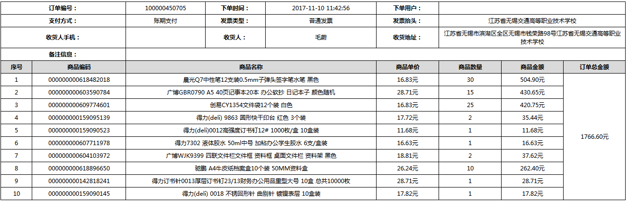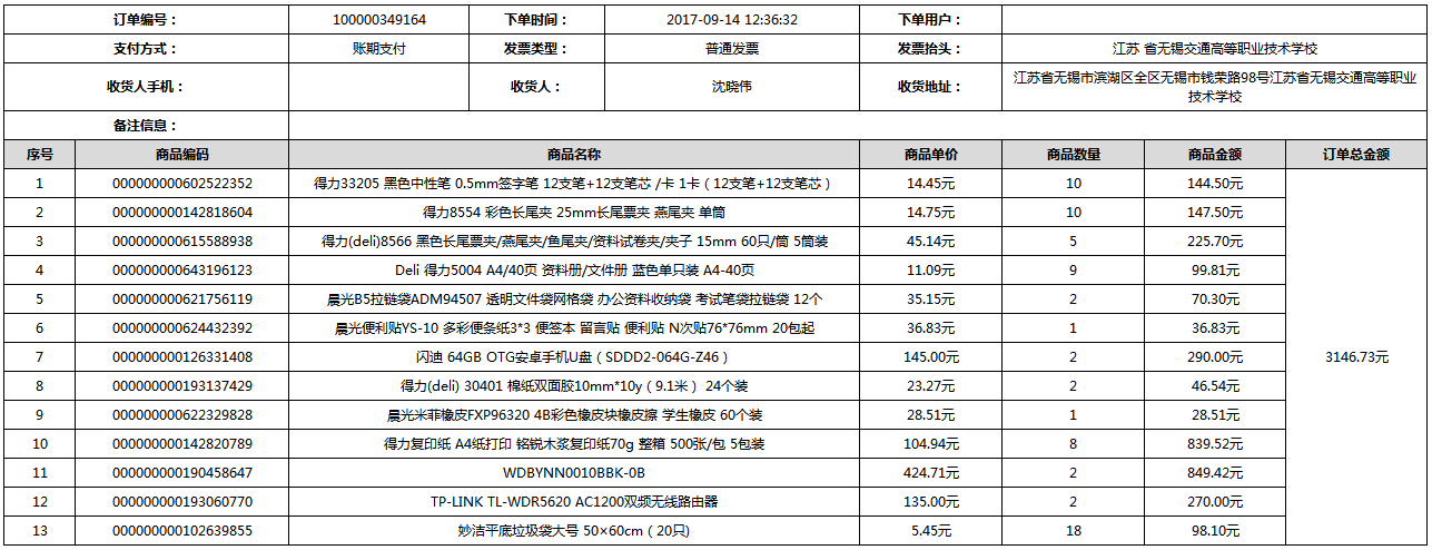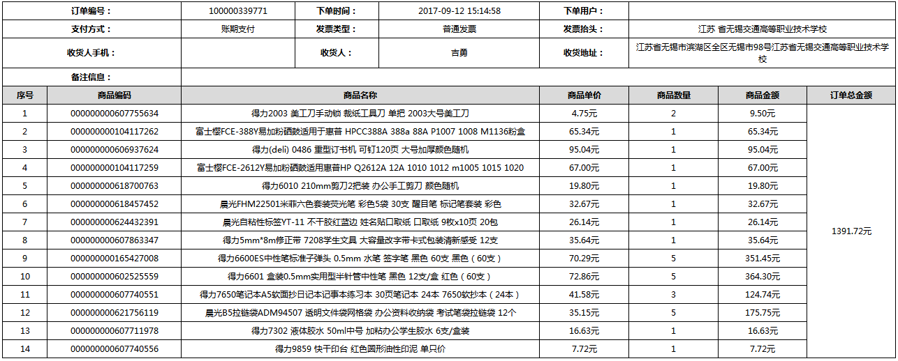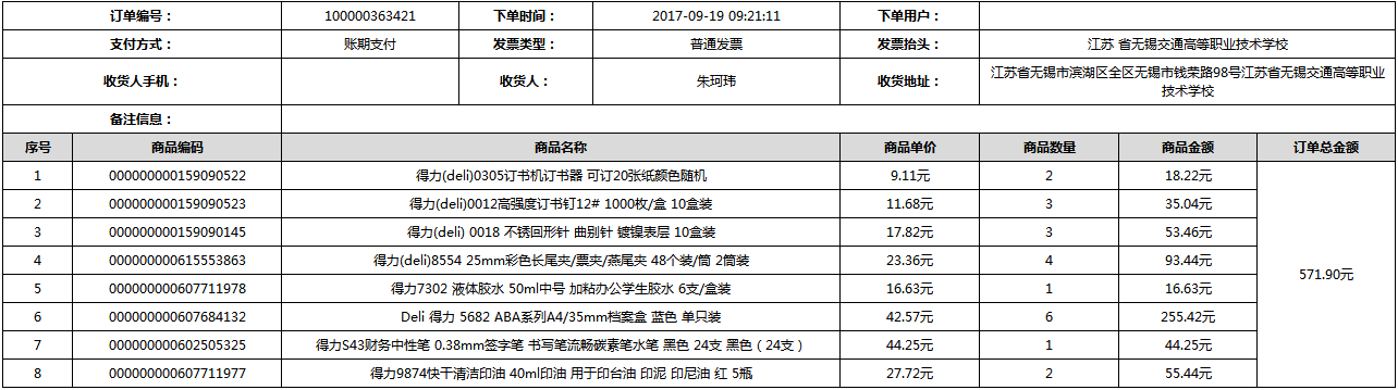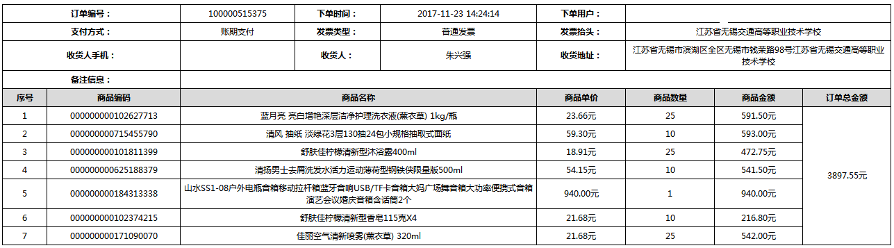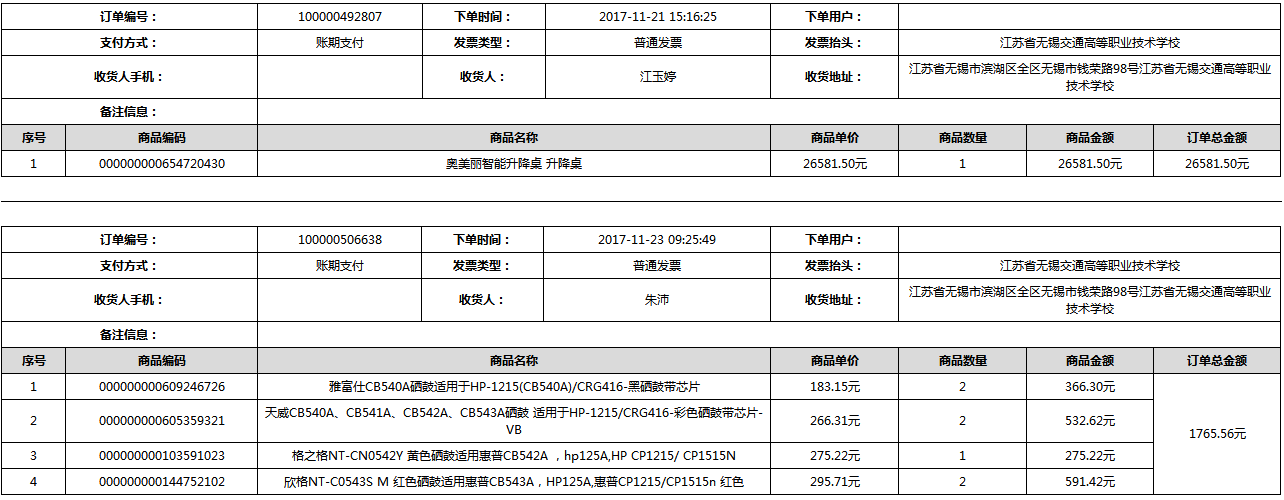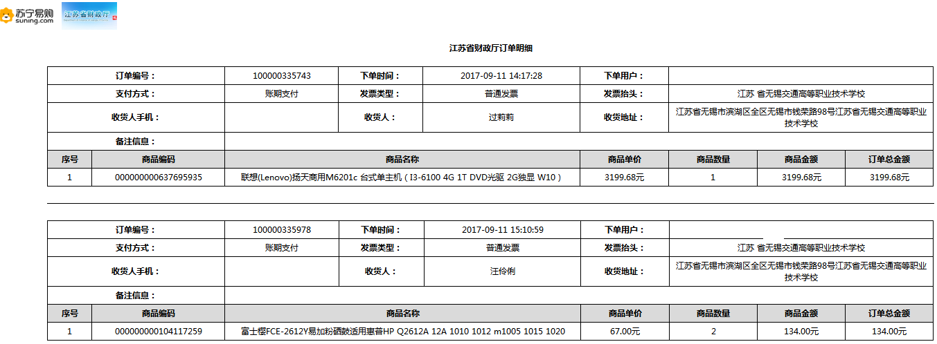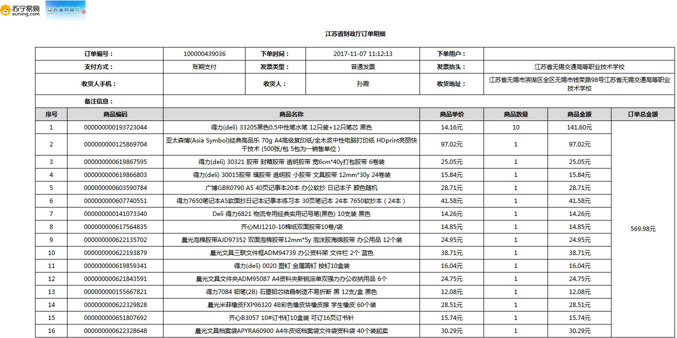 根据江苏省财政厅政府采购《关于在省级预算单位实行网上商城采购的通知》苏财购(2015)45号、《江苏省省级政府采购网上商城管理暂行办法》苏财购〔2015〕48号、《关于网上商城采购有关事项的补充通知 》苏财购〔2016〕18号、《关于推广江苏省省级政府采购网上商城采购有关工作的通知 》苏财办〔2016〕42号相关文件精神,建立江苏省省级政府采购网上商城专属采购平台。结合《关于省级“网上商城”支付方式的政策说明》及我校实际。依据《转发财政部关于进一步做好政府采购信息公开工作有关事项的通知》苏财购[2017]50号现就2017年9月14日-2017年11月27日网上商城采购订单明细进行公示: