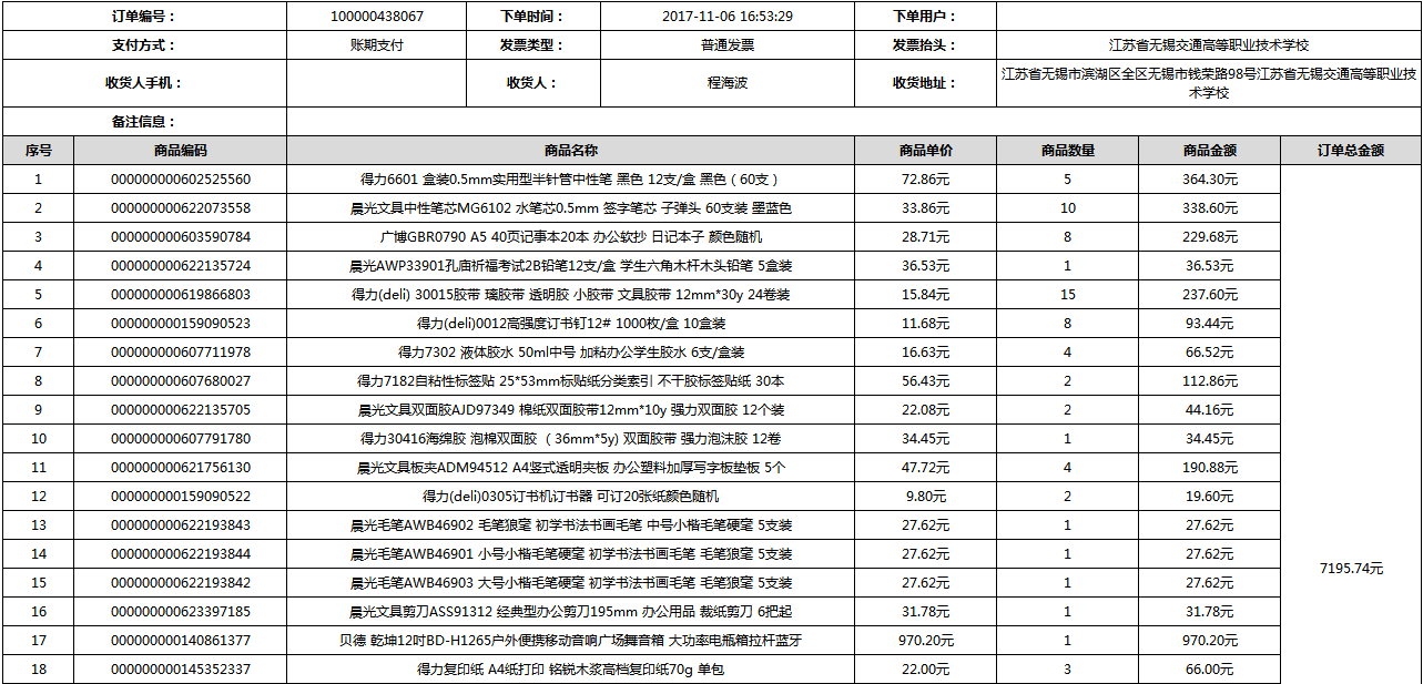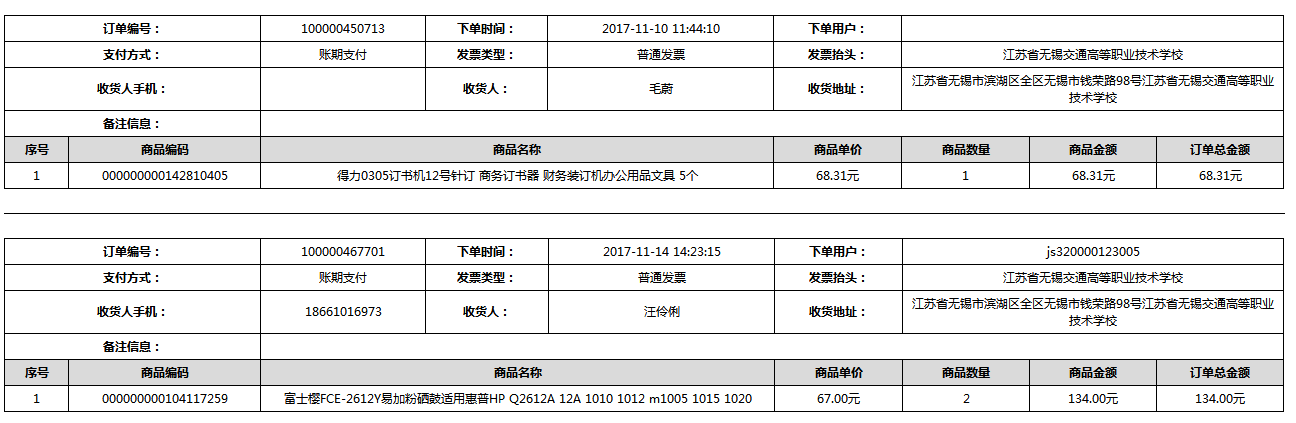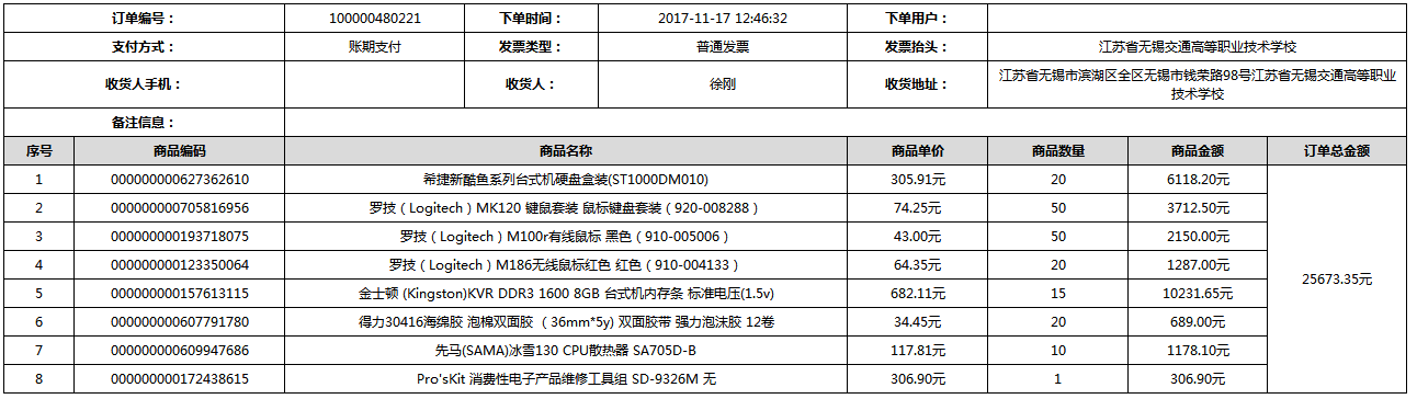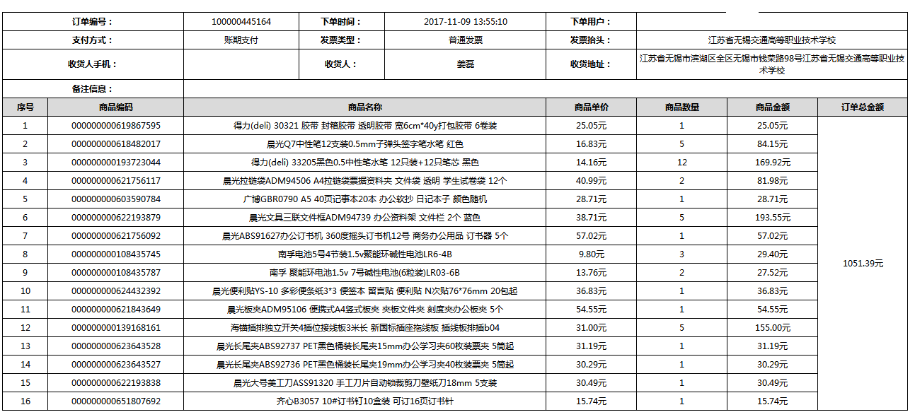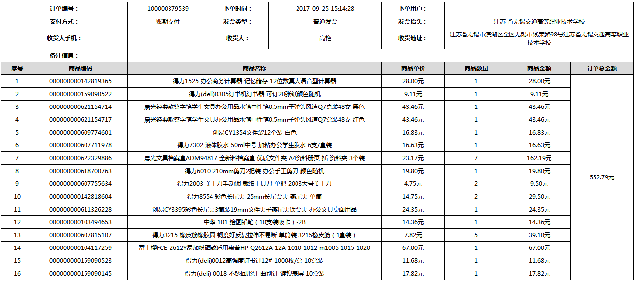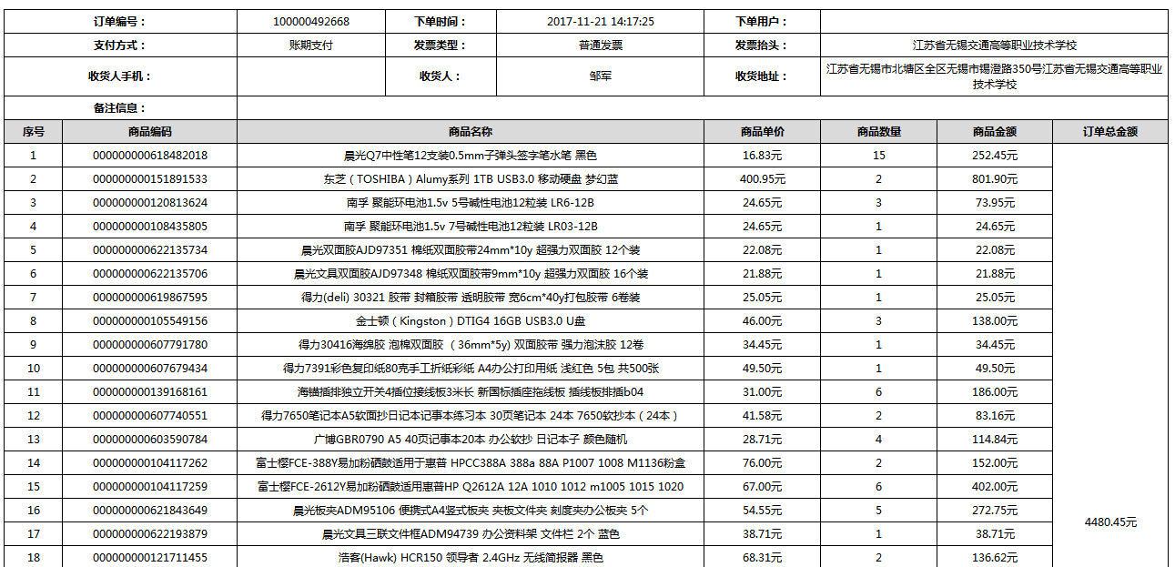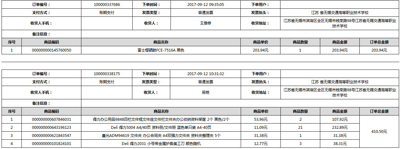 根据江苏省财政厅政府采购《关于在省级预算单位实行网上商城采购的通知》苏财购(2015)45号、《江苏省省级政府采购网上商城管理暂行办法》苏财购〔2015〕48号、《关于网上商城采购有关事项的补充通知 》苏财购〔2016〕18号、《关于推广江苏省省级政府采购网上商城采购有关工作的通知 》苏财办〔2016〕42号相关文件精神,建立江苏省省级政府采购网上商城专属采购平台。结合《关于省级“网上商城”支付方式的政策说明》及我校实际。依据《转发财政部关于进一步做好政府采购信息公开工作有关事项的通知》苏财购[2017]50号现就2017年9月14日-2017年11月27日网上商城采购订单明细进行公示: