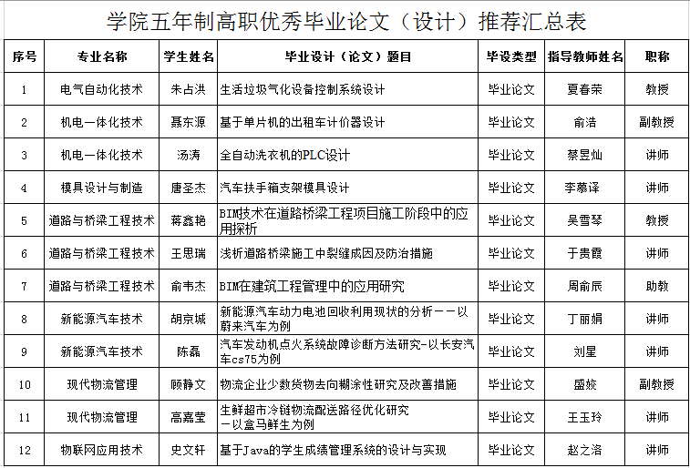 根据江苏联合职业技术学院《关于开展学院2023年度五年制高职优秀毕业论文(设计)认定工作的通知》(苏联院教〔202330号),经各学院评审推荐,学校审核,拟推荐《基于单片机的出租车计价器设计》等12篇毕业论文,参加江苏联院五年制高职优秀毕业论文(设计)认定。具体名单见附件。