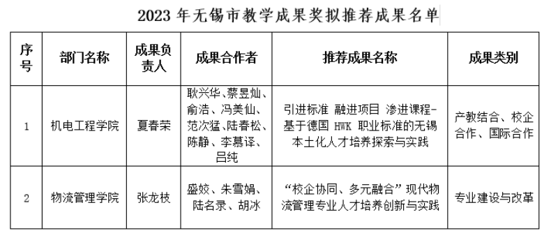 根据无锡市教育局《关于做好2023年无锡市教学成果奖申报评选工作的通知》(锡教函〔2023〕152号),学校组织开展了2023年无锡市教学成果奖的申报推荐工作。通过个人申报、院部遴选推荐、学校教学工作委员会评审,结合学校《关于公布2023年学校教学成果奖获奖项目的通知》(省锡交教(2023)17号),报校领导研究决定,拟报送以下教学成果为我校报送作品。