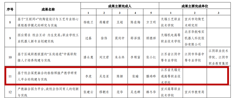 根据“无锡市教育局关于公布 2019无锡市教学成果奖评选结果的通报”(锡教发〔2020〕36 号),评选出2019年市教学成果奖100项,其中中等职业教育类成果11项。我校李虎书记主持的《基于校企深度融合的船舶焊接产教学研育人平台的构建与实践》,荣获2019年无锡市教学成果奖一等奖。