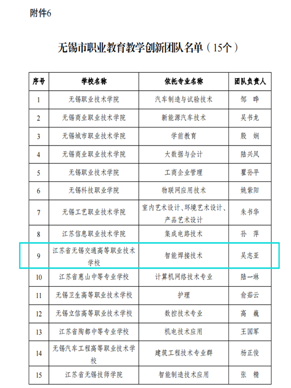 根据市教育局、市人力资源社会保障局《关于公布无锡市职业教育质量提升攀登计划2022年度重点项目名单的通知》(锡教高职发【20228号)的文件精神,学院3个项目入选:船舶智能制造产教融合平台被认定为产教融合集成平台;智能焊接技术教学团队被认定为教学创新团队;赵文杰同学被认定为技能雏鹰。