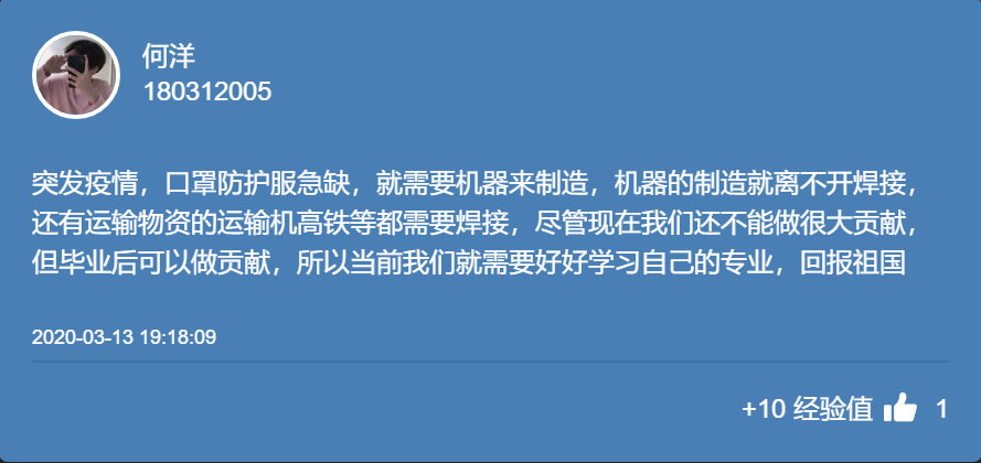 3月12日,在班主任滕老师主持下,181121班全体同学利用云班课平台召开“我为疫情做贡献”网络主题班会。滕老师通过提前发布焊接工程师者在建设火神山医院的网络报道和相关照片,让同学们展开讨论,作为焊接专业学生,我们如何为抗击疫情做贡献。