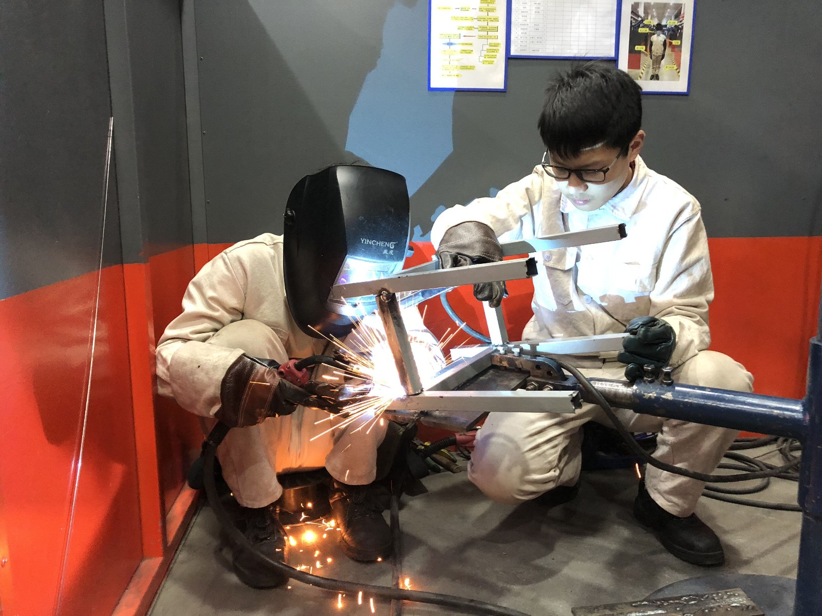 “雷锋是时代的楷模,雷锋精神是永恒的”,171121班贾建男、沈星宇等同学利用自己的专业特长践行雷锋精神,他们将破损的板凳在焊接操作岗位中进行焊补,破损的板凳在电弧光的闪烁下焊接组装完成。因铁板凳的方管较薄,在修理的过程中还遇到了薄板焊接难题,大家积极探讨,请教班主任老师,通过反复尝试后攻克了难题,同学们在做好事的同时又学到了新的技能。