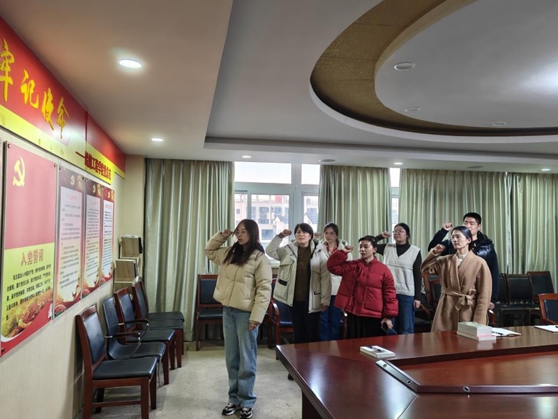 随后,在鲜红的党旗下,全体党员佩戴党徽,举起右拳,由沈丽兰同志领誓,庄严重温入党誓词。铿锵有力的誓言既是对入党初心的回溯与叩问,也是对未来使命的承诺与践行。通过重温誓词,党员们再次感受到入党时的庄严承诺和坚定决心,进一步增强了四个意识、坚定了四个自信、做到了两个维护,凝聚起为党和人民事业奋斗终身的共识与力量。