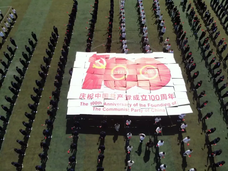 动感的啦啦操表演和广播操表演结束后,百名师生齐聚操场正中央,用一百块KT板拼凑成庆祝中国共产党成立100周年的活动标识,在场的师生手摇小国旗一同合唱《没有共产党就没有新中国》,真挚地表达交校师生浓浓的爱党爱国之情。