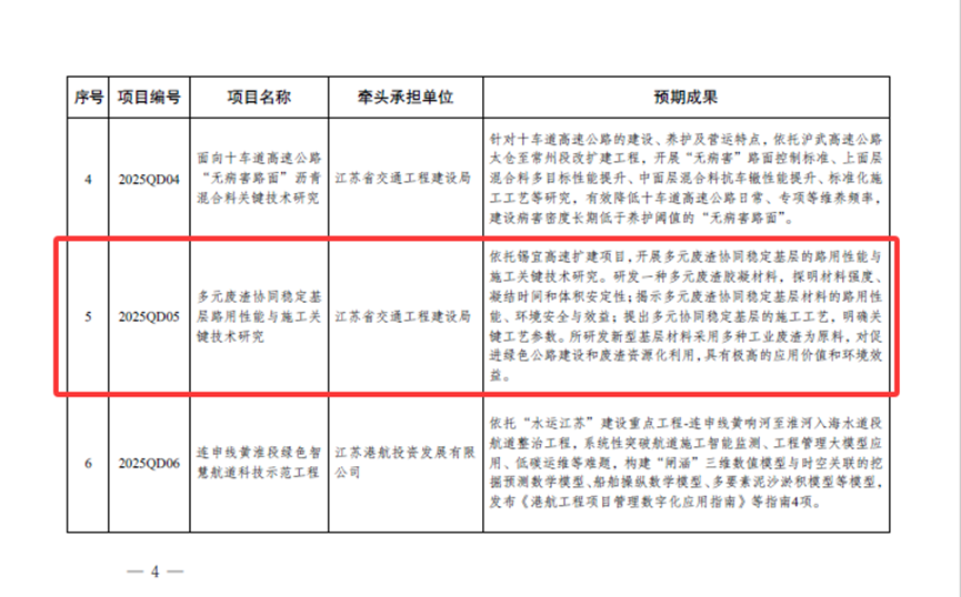 近日,江苏省交通运输厅正式印发《2025 年度全省交通运输重点科技项目清单》,全省仅 9 个项目通过严格评审入选。其中,由江苏省交通工程建设局委托、我校承办的《多元废渣协同稳定基层路用性能与施工关键技术研究》(项目编号:2025QD05)成功上榜,这一成绩的取得,源于我校与省交建局沪武锡宜扩建指挥部 “青年启航助力锡宜” 产学研合作的深度赋能,标志着双方产教融合、科教融汇的合作模式取得实质性突破,也彰显了我校在公路绿色建造领域的科研创新实力。
