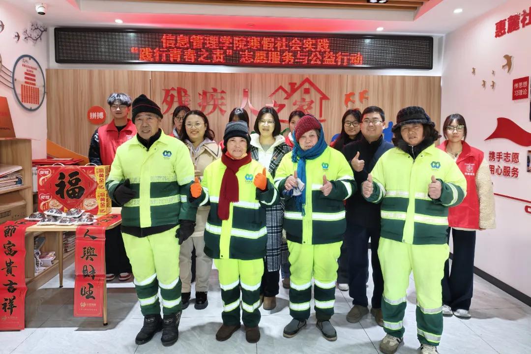信息管理学院党总支书记蒋红梅、计算机技术教研室党支部书记朱沛、支部组织委员王得雪,携手汇润捷公司工作人员以及十余位学生志愿者,走进梁溪区山北街道惠麓社区,开展“党建引领聚爱心,寒冬慰问显温情”公益活动,为一线环卫工人送上腊八粥、姜茶及新春对联,暖意驱散冬日严寒。