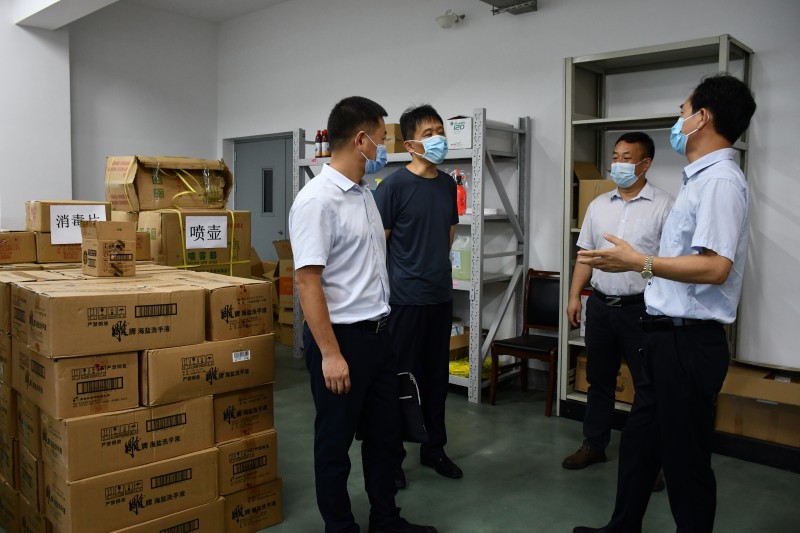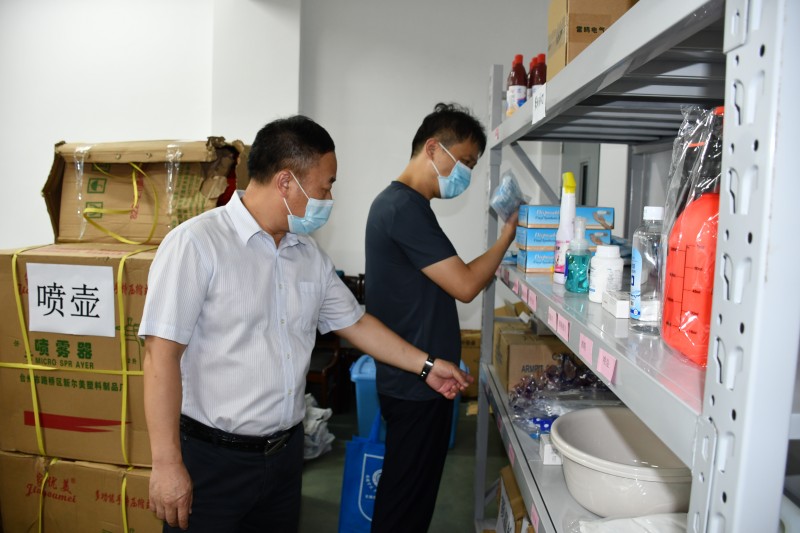 孔组长一行在学校副校长耿兴华的陪同下,实地查看了学校疫情防控工作,现场调研了学校疫情防控物资仓库,翻阅了《开云·官方端网页版登录入口新型冠状病毒感染的肺炎疫情防控工作方案》《学校疫情防控期间校园通风消毒及卫生工作实施方案的通知》等文件和制度。