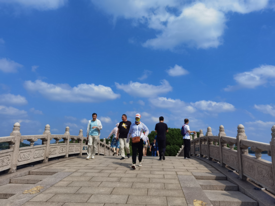 八点刚过,老师们早已到达起点,天空睛朗,霞光万道,大家合影留念后,从蠡湖之光向东出发开始了5km徒步之旅沿着环西蠡湖小圈向渔夫岛行进、范蠡塑像是首个打卡点,大家漫步范蠡堤、渤公岛,一路欣赏美景、接受文化熏陶、在蠡湖展示馆完成二次打卡、再环湖路行走,最后回到终点蠡湖之光。10点大部分参赛队伍到达终点,正值百米高喷启动,彩虹乍现,大家百米高喷来个合影记录这一美好时刻。