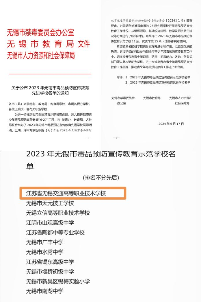 近期,在市禁毒办、教育局、人社局联合举办的2023年无锡市毒品预防宣传教育示范学校展示活动当中,学校被评为2023年无锡市毒品预防宣传教育示范学校。