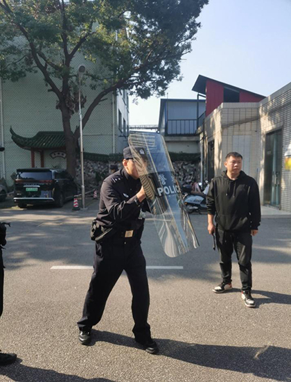 民警先是向学校安保工作人员讲解了防暴钢叉、盾牌、防暴棍等防护器械的正确使用技巧,并在现场对防护器械的使用方法进行演示,现场还对校方保卫人员器械使用中错误动作进行了纠正。器械使用培训后,民警又组织"暴徒"冲击校门的实例防暴演练,学校安保人员迅速反应、报警求助的同时,迅速形成多对一体作战体系,使用防卫器械将“暴徒”制伏。