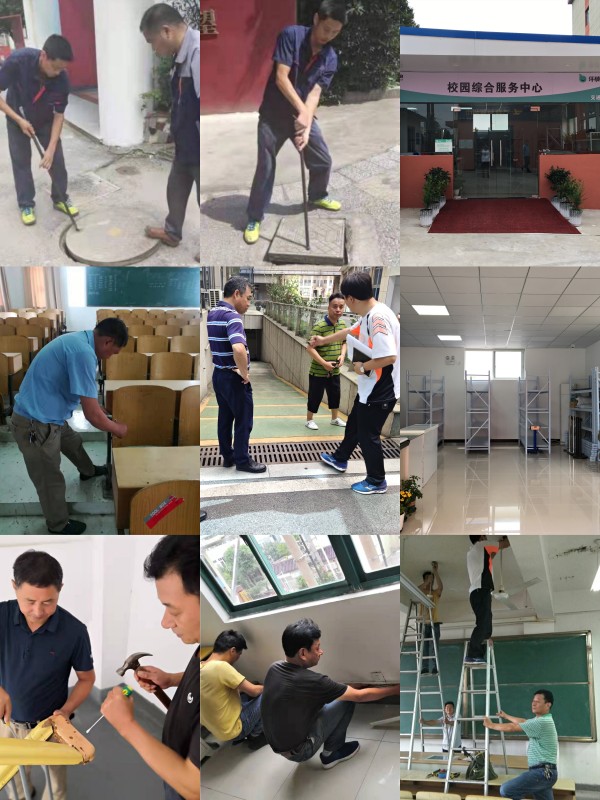 后勤管理处利用暑期时间,进行了学校卫生间项目改造、节能灯安装、空调维保、书店项目改造、快递房建设、学校教室和宿舍零星维修等工作。暑期工作任务重、时间紧、要求高,后勤管理处领导多次带队巡查校园,深入施工现场,查看工作进度和安全情况,争分夺秒在秋季开学前完成学校各项改造出新及维修工作。