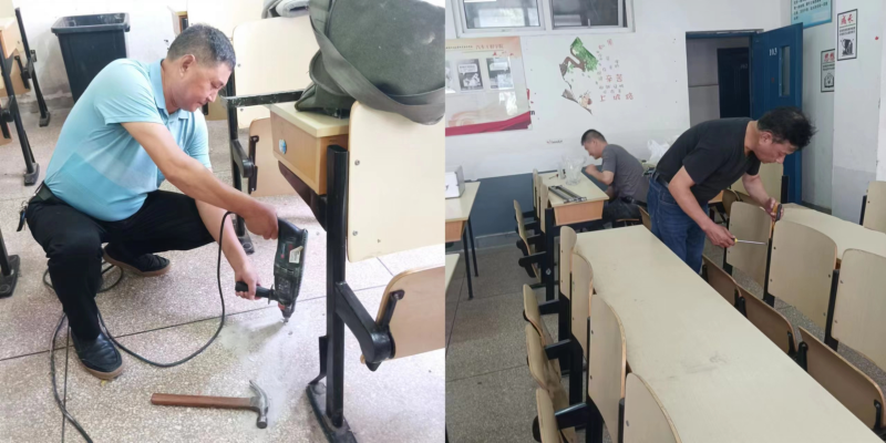 后勤管理处维修组成员利用暑期时间,维修教室连体课桌椅1280套、维修窗帘52个、维修教室门锁16把、维修教室讲台22个、更换围墙灯50只,维修学生宿舍455间等工作。后勤管理处领导多次带队巡查校园,查看工作进度和安全情况,争分夺秒在暑假结束前完成学校各项维修工作。