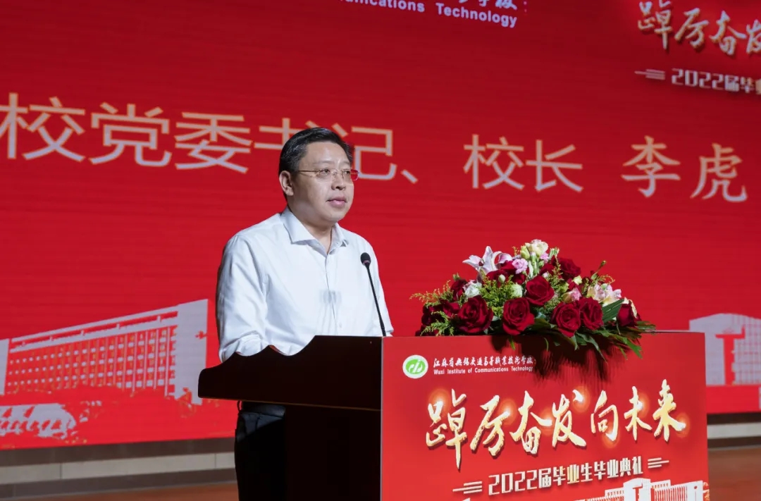 学校党委书记、校长李虎代表学校向圆满完成学业的2022届全体毕业生表示热烈的祝贺,并发表毕业寄语。李书记提出三点期望:期望同学们心存梦想,胸怀天下。要将个人命运和国家发展紧密相连,把个人事业与时代发展紧密相融,才能拥有源源不断的人生动力、开拓更为广阔的人生际遇、书写光辉灿烂的人生华章。期望同学们始于初心,臻于匠心。作为新时代的职业人,要在平凡的工作岗位上践行“精益求精、追求卓越”的精神,始终保持对新技术、新领域的好奇心,真正成为企业所需、产业所用、行业所求的高素质技术技能人才。期望同学们勇于担当,成就幸福。要做生活的积极参与者,担负家庭责任,赡养老人,教育子女,奉献社会,坚持向上、向善,走人间正道,创造美好幸福生活。