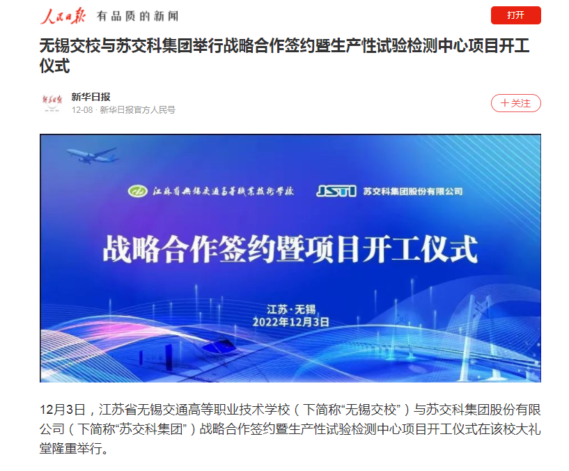 人民日报:无锡交校与苏交科集团举行战略合作签约暨生产性试验检测中心项目开工仪式