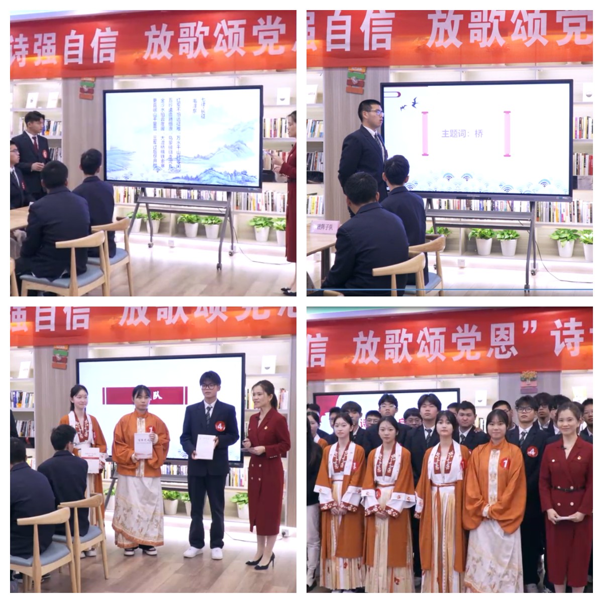 活动开始,由主持人带领全场选手朗诵了毛主席诗词《七律•长征》,一起领略了党史和诗词的无限魅力。本次活动尤其精彩的是在“飞花令里扬精神”环节,以“路”“桥”“国”为主题词进行PK,这种方式既能感悟专业文化底蕴、又能提升学生的专业学习热情、激发树立使命感