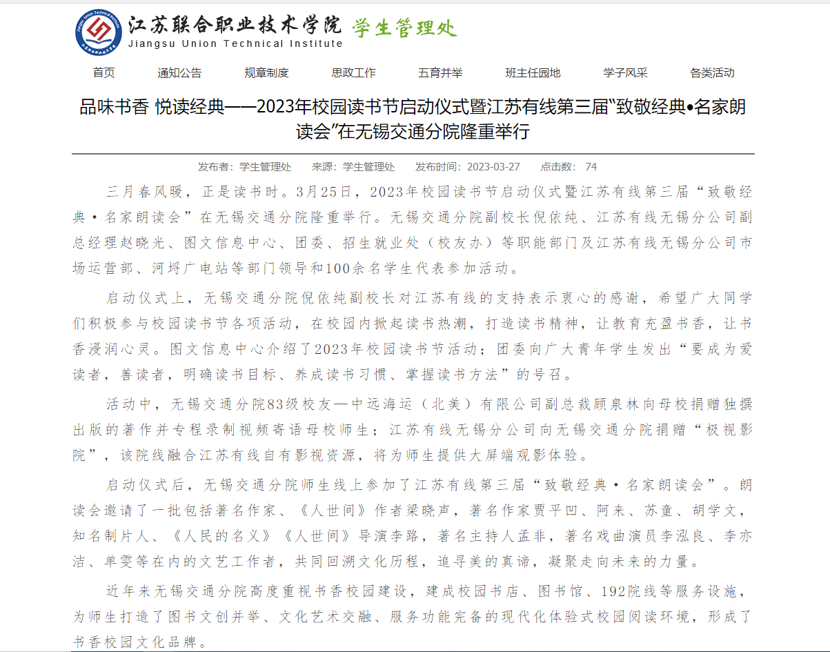 江苏联合职业技术学院官网:2023年校园读书节启动仪式暨江苏有线第三届“致敬经典•名家朗读会”在无锡交通分院隆重举行