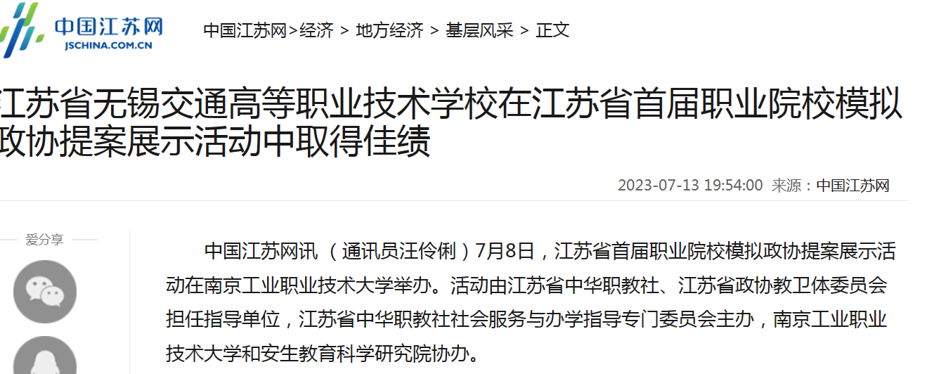 江苏联院:无锡交通分院在江苏省首届职业院校模拟政协提案展示活动中取得佳绩