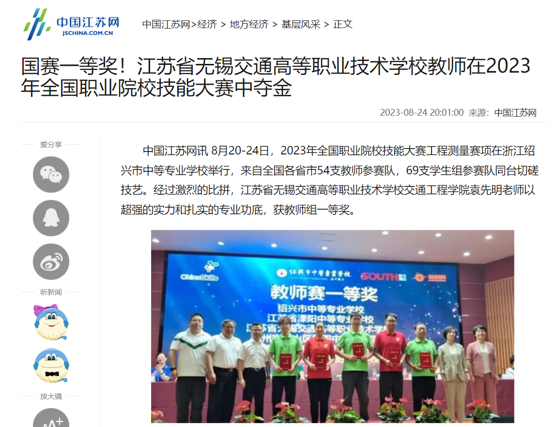 下一篇: 江苏交通:无锡交校教师获全国职业院校技能大赛工程测量赛项一等奖