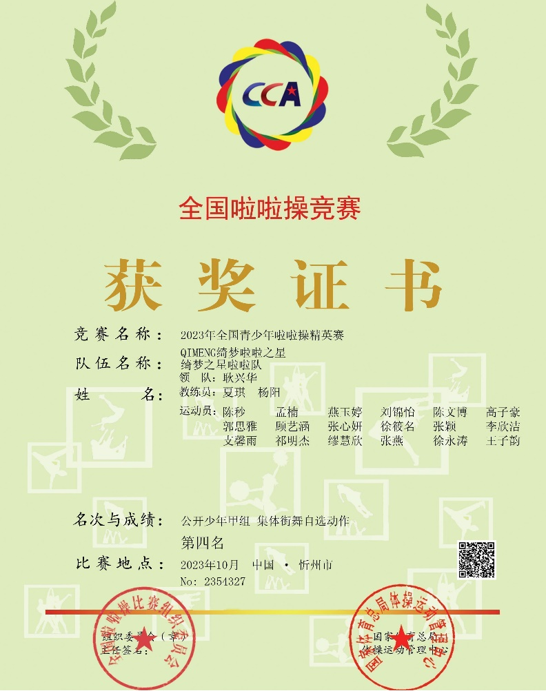10月12-13日,2023年全国青少年啦啦操精英赛在线上举行,此次赛事由国家体育总局体操运动管理中心主办,全国啦啦操委员会协办,大赛吸引来自全国各地100支队伍、近2000名运动员参加。经过线上角逐,我校绮梦啦啦操队荣获公开少年甲组-集体街舞自选动作第四名。