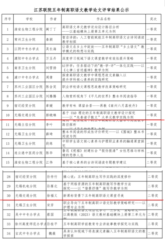 近日,江苏联合职业技术学院教学论文与教学案例评比结果公布,我校晓琳老师获得教学论文评比、教学案例评比双料一等奖;徐福义老师荣获教学论文评比二等奖。