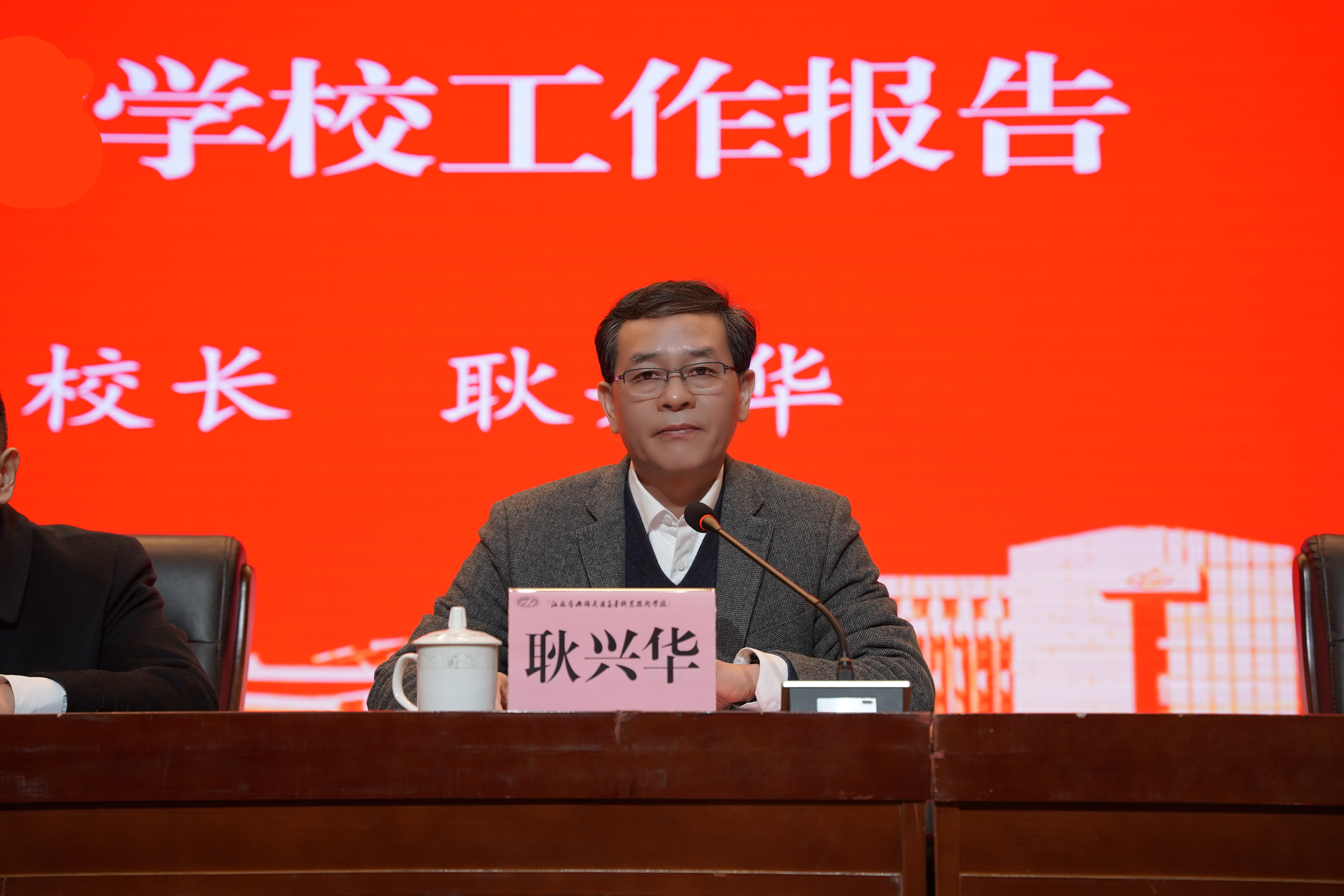 校长耿兴华作2025年度学校工作报告,围绕 “回望‘十四五’、盘点2025、展望‘十五五’”三个维度展开。他指出,2025 年作为“十四五”收官之年,学校攻坚克难、精彩收官,党的建设全面深化,教育教学守正创新,产教融合双向赋能,师资队伍积蓄动能,学生工作五育融合,办学保障提质增效,各项事业均取得亮眼成绩,但也要认识到学校在办学条件、专业建设、师资结构等方面存在的短板。他阐述了“十五五”发展的战略构想与行动方略,围绕创建国家级“双优”学校,对标三年制高职院建设标准,明确了“党建领航工程、铸魂育人工程、专业迭代工程、人才强校工程、产教融合工程、开放办学工程、数智赋能工程、治理创新工程、文化建设工程、保障提质工程”等十大重点工程实施计划,为学校未来五年发展指明了方向。