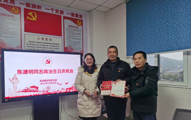 2021年12月24日下午,英语教研室党支部在部门会议室召开陈建明同志“政治生日”庆祝会。基础教学部党总支副书记杨凤琴和支部全体党员参加了庆祝会,英语教研室党支部书记曹维忠主持了会议。