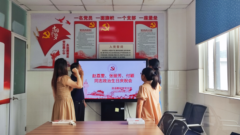 2023年9月27日下午,英语教研室党支部全体党员在部门会议室为赵荔雯、张丽芳、付颖三位党员同志庆祝“政治生日”。