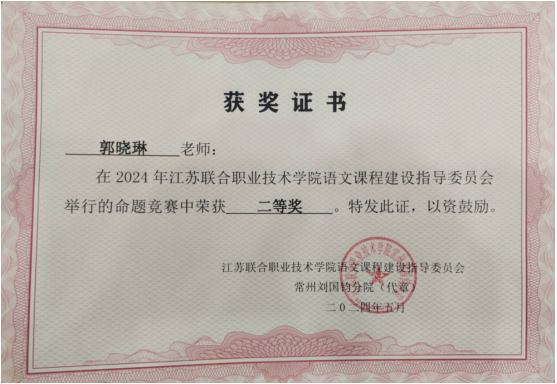 近日,江苏联合职业技术学院公布了五年制高职语文命题竞赛的获奖名单。该竞赛面向学院五年制高职在职语文教师,旨在推进《五年制高等职业教育语文课程标准》的贯彻和运用,推动五年制高职语文课程建设。我校基础教学部语文教师吕卉、郭晓琳分获一、二等奖。