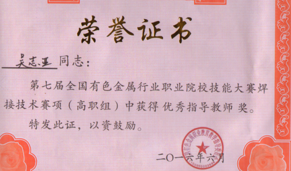 第七届全国有色金属行业焊接技术技能竞赛指导教师奖