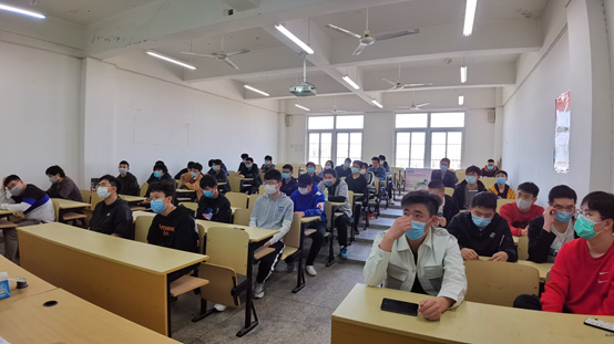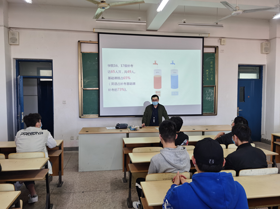 2020年4月25日中午,机电工程学院16、17级补考学生在阶梯教室514参加了2019-2020学年第一学期补考动员会。会上,机电工程学院副院长俞浩给大家做了学情分析,提醒学生补考不合格的后果及影响,要求同学们重视补考过程及结果,从什么时间补考辅导、复习到什么时间考试、地点在哪,都要做到心中有一本账,及时复习,积极迎考。