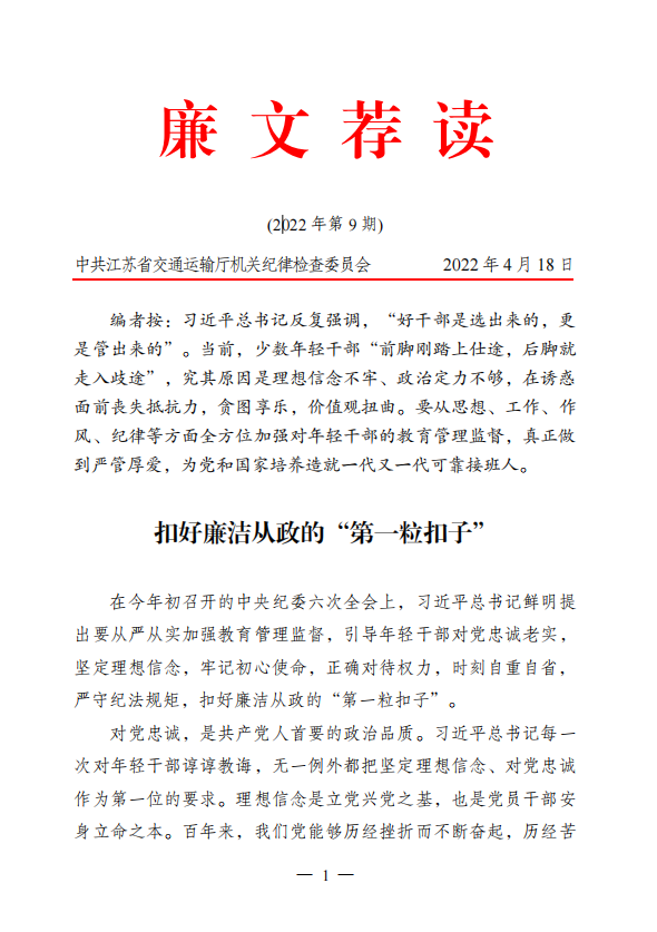 2022年廉文荐读第9期——扣好廉洁从政的“第一粒扣子”