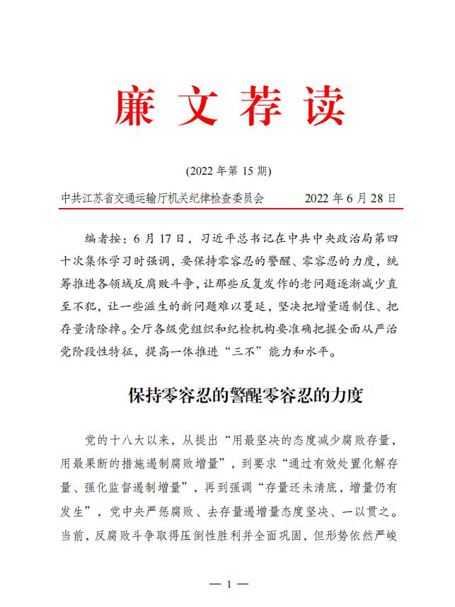 2022年廉文荐读第15期——保持零容忍的警醒零容忍的力度