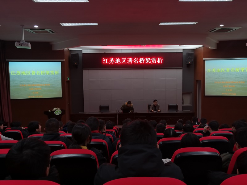 2019年12月25日下午,交通工程学院在校学术报告厅成功举办了《江苏地区著名桥梁赏析》讲座。讲座主讲人是王义国副教授,交通工程学院19级学生及相关班主任老师等一百多人听取了讲座。讲座由学院邹定南院长主持。