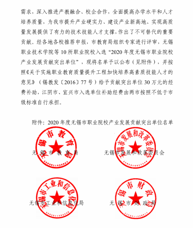 128日,无锡市教育局发布了《关于公布无锡市职业院校促进产业发展贡献突出单位名单的通知》(锡教发〔2020101号),我校获评2020年度无锡市职业院校促进产业发展贡献突出单位。