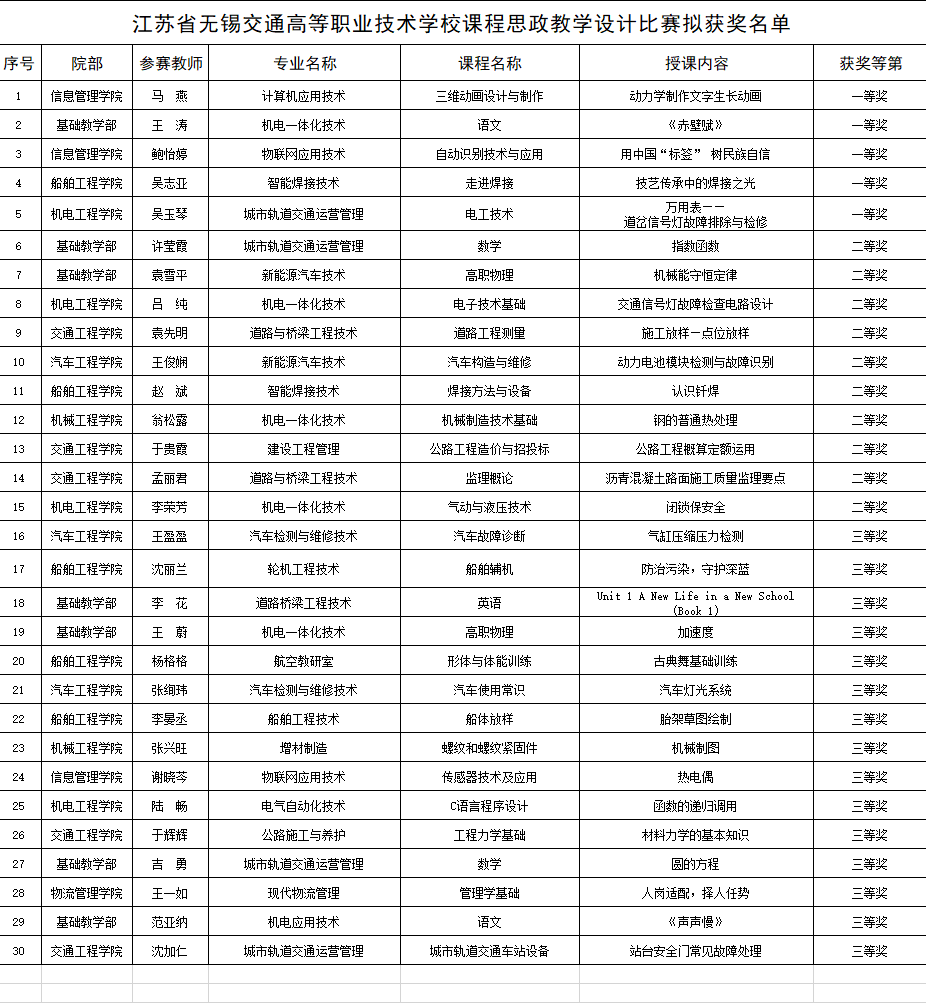 为全面贯彻落实高校思想政治工作会议和全国教育大会精神、教育部《高等学校课程思政建设指导纲要》(教高〔2020〕3号)文件精神,落实立德树人根本任务,全面推进课程思政建设,充分发挥课堂主渠道在学校思想政治工作中的作用,总结凝练学校在课程思政教学方面的典型经验,推进和带动课程思政改革。根据学校《关于开展学校2024年课程思政教学设计比赛的通知》,学校组织开展了课程思政教学设计征集和评选活动,经自主申报、院部推荐、教务处审核和专家评审,评选出30件获奖作品,其中一等奖5项、二等奖10项、三等奖15项。现将结果进行公示,名单见附件,公示期为:2024年6月23日至6月27日,如有异议请与教务处联系,联系电话:68781132。