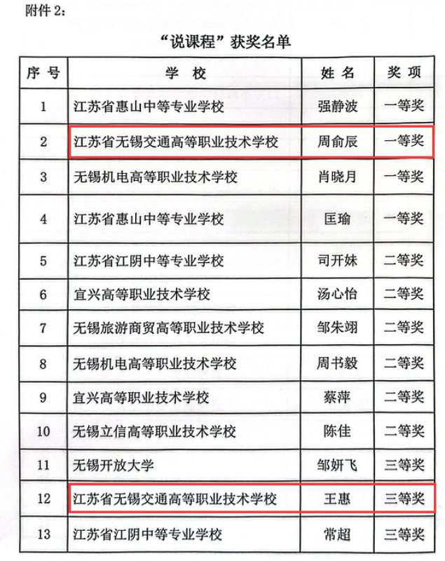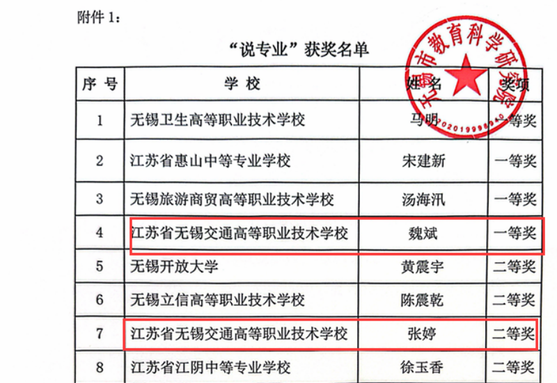 近日,在无锡教育科学研究院公布的2024年无锡市职业学校“说专业、说课程”比赛获奖名单中,我校魏斌老师在“说专业”比赛中荣获一等奖,张婷老师在“说专业”比赛中荣获二等奖,周俞辰老师在“说课程”比赛中荣获一等奖,王惠老师在“说课程”比赛中荣获三等奖。