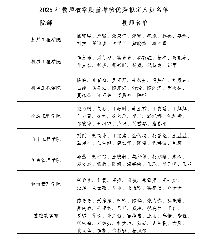 为加强教学质量管理,客观评价教师教学质量,充分调动教师教书育人工作的积极性和创造性,促进教育教学改革和教学质量的不断提高。根据《开云·官方端网页版登录入口教师教学质量考核实施方案(试行)的通知》(省锡交﹝2021〕35号),本着“公正、公平、公开”的考核原则,各教学院部经个人自评、教研室复评、党政联席会议审核、结果公示等流程组织了考核工作,并将考核结果反馈至教务处汇总,经学校教学工作委员会审核、校务会审定,2025年共有309人参加考核,滕玮晔等123名教师教学质量考核为优秀,杨兵等186名教师教学质量考核为良好,无合格或不合格(考核结果详见附件)。公示时间:2026年3月25日—3月30日。如有异议,请实名向教务处反映,联系方式:0510-68781132。