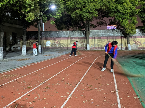 4月4日晚上,大风把香樟树的叶子吹落了一地。同学们自觉放下手机,主动的扛起扫把,来到操场上,借助路灯的光亮,把校区的跑道、篮球场打扫得干干净净。春天的夜晚还有些许凉意,志愿者们却全然不顾,他们干得一丝不苟,干得热火朝天。疫情下的每一位同学都是无比的可爱。