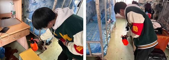 在消杀过程中,学生会的同学们严格执行消杀工作,并落实到每一个宿舍,每一个角落,尽可能让消杀更全面,让病菌无法传染到宿舍的每一位同学。