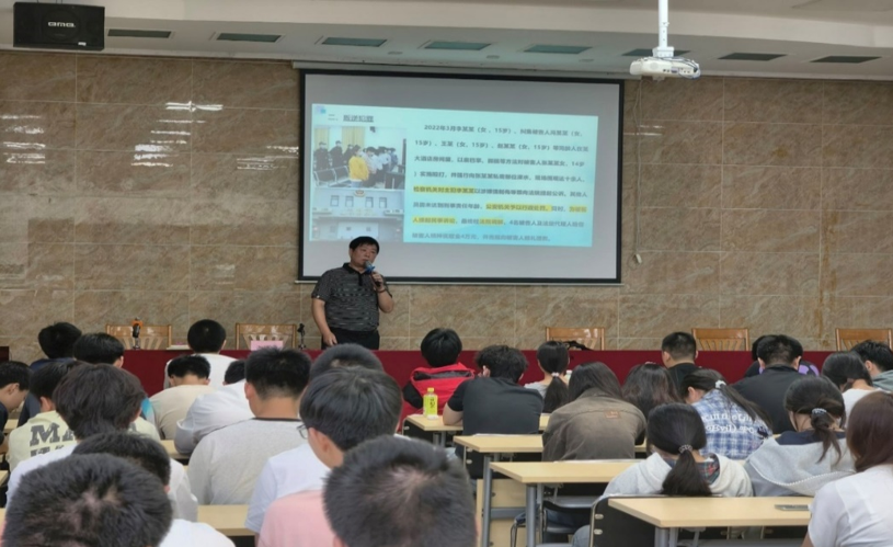本次宣讲共有两项议程,首先谢检察官给学院团总支书记翁松露老师赠书;接着谢检察官结合学生常见法律风险场景,以“案例剖析+法律解读”的形式展开讲解。他围绕“学法、懂法、守法”、“以案释法”、“四种新型犯罪”等角度进行了宣讲。