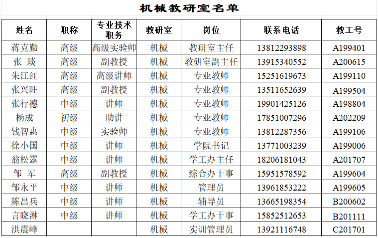 机械工程学院机械教研室人员情况
