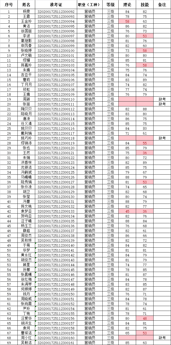 2025年11月23日,69名企业人员参加营销员三级技能等级认定考试(考试批次:2025-32020017-00045),共计55名成绩获得合格。现将考试成绩公示如下:
