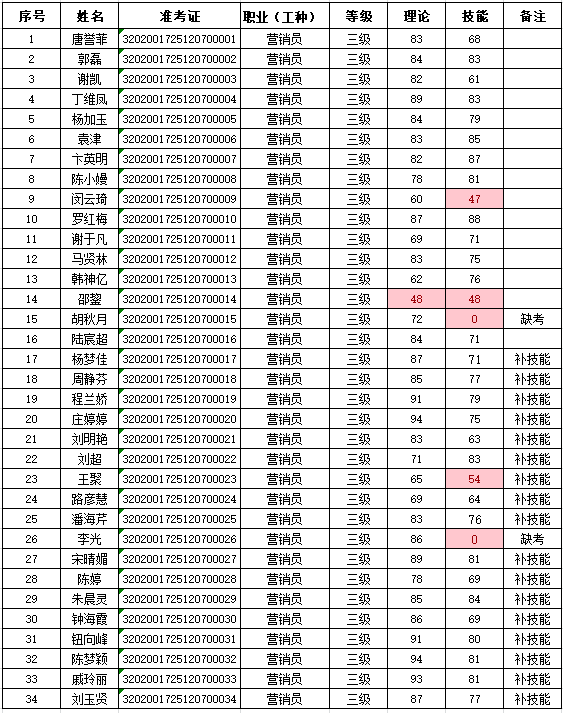 2025年12月7日,34名企业人员参加营销员三级技能等级认定考试(考试批次:2025-32020017-00048),共计29名成绩获得合格。现将考试成绩公示如下: